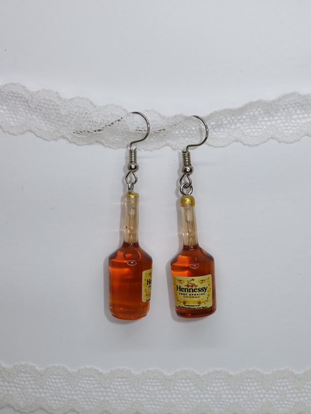 Paire de boucle d'oreille bouteille pendante, sur monture argentée.