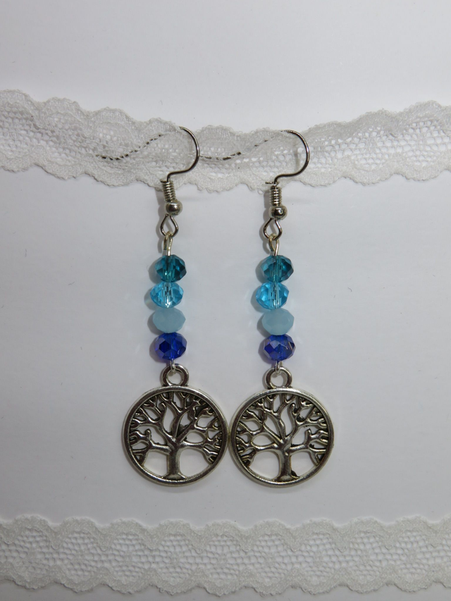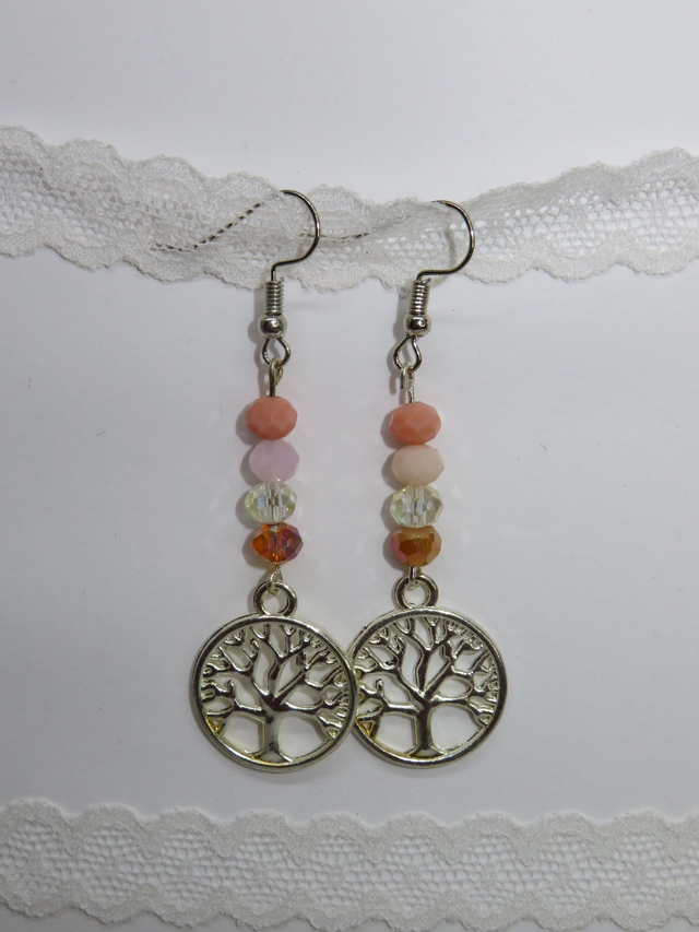 Paire de boucle d'oreille pendante en perle de cristal Tchèque et breloque arbre de vie, sur monture argentée.