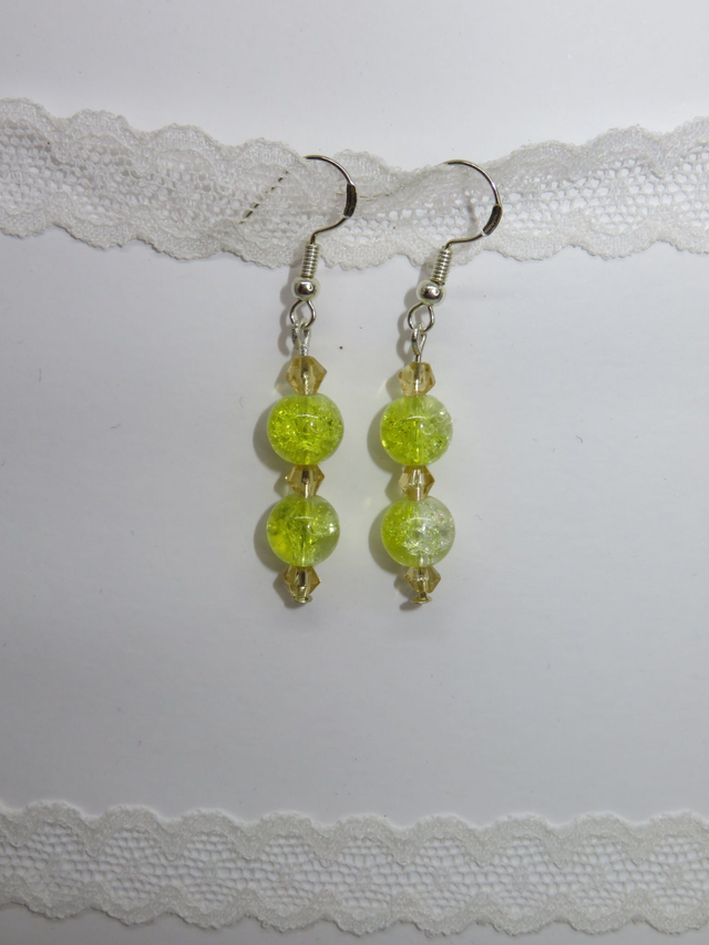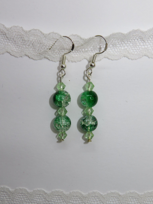 Paire de boucle d'oreille pendante en perle de verre craquelée et perle de cristal, sur monture argentée.