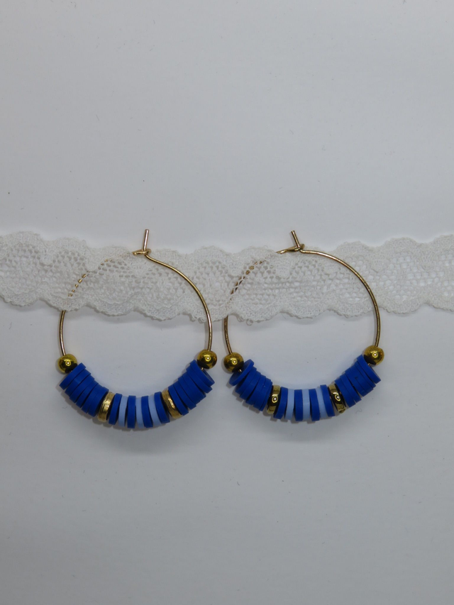 Paire de créole en perle Heishi et perle acrylique, sur monture dorée.